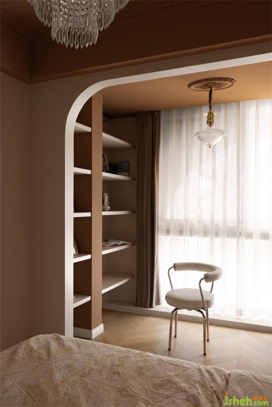 書房兼臥室,陽臺(tái)納入臥室,增加空間感,公館裝修設(shè)計(jì)滿足桃子的需求,整體線條流暢、美觀。