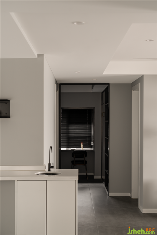 過道:地面運用的是微水泥地磚,深灰色置頂柜與落地窗形成自然的光影效果。