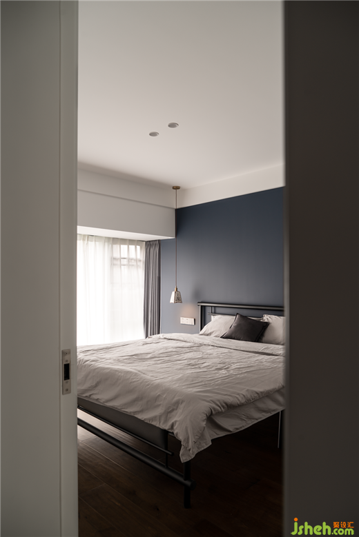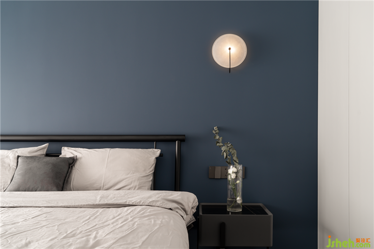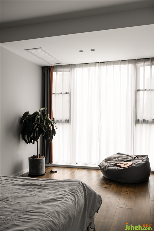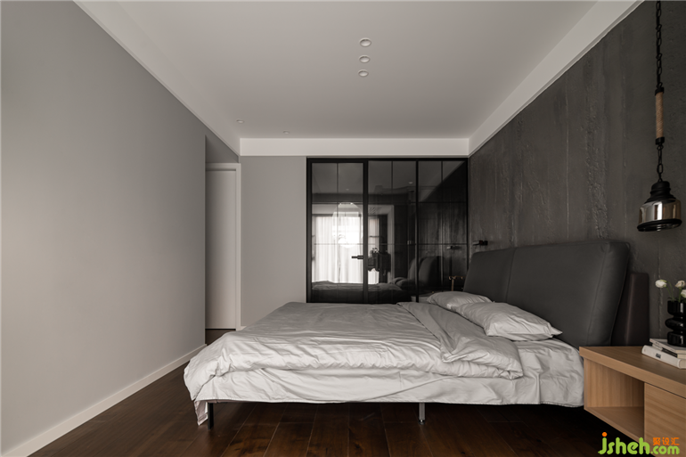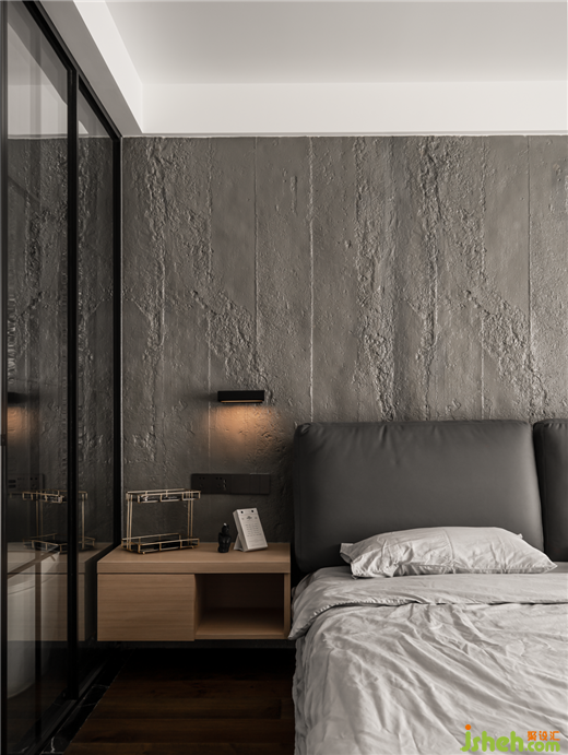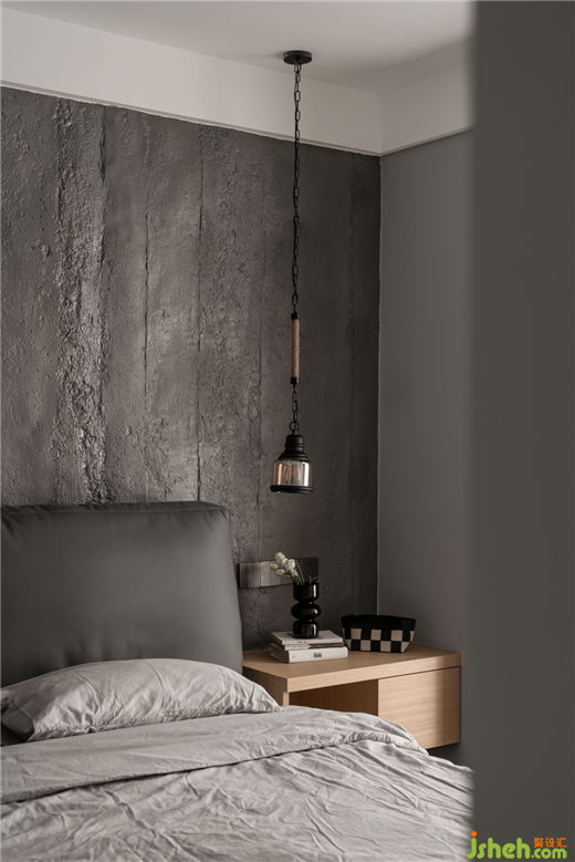 臥室:床頭背景墻采用的是水泥板,色調(diào)相對較深,搭配原木地板,與定制的家具,素雅低調(diào),打造出靜謐的效果,讓主人回到一個舒適的休憩空間。