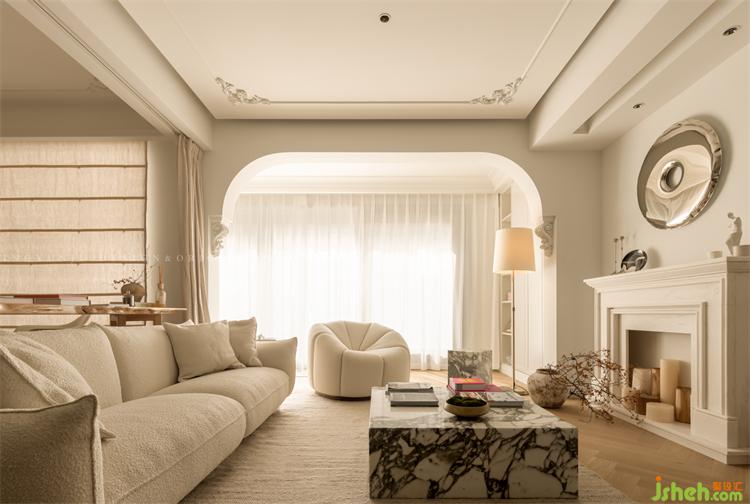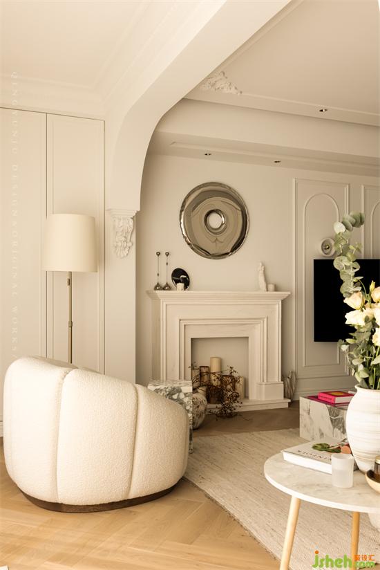 杭州錦麟府裝修設計獨特的雕花造型+弧形元素,體現(xiàn)出經(jīng)典的法式風,裝飾壁爐+圓形金屬裝飾品,將現(xiàn)代元素恰到好處地融入法式風。