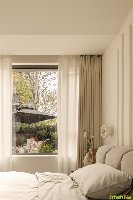 臥室大面積的玻璃窗搭配米色窗簾,杭州錦麟府裝修設(shè)計讓明亮的光線更加柔和。搭配暖色調(diào)的吊燈,讓空間顯得暖意更濃。