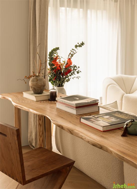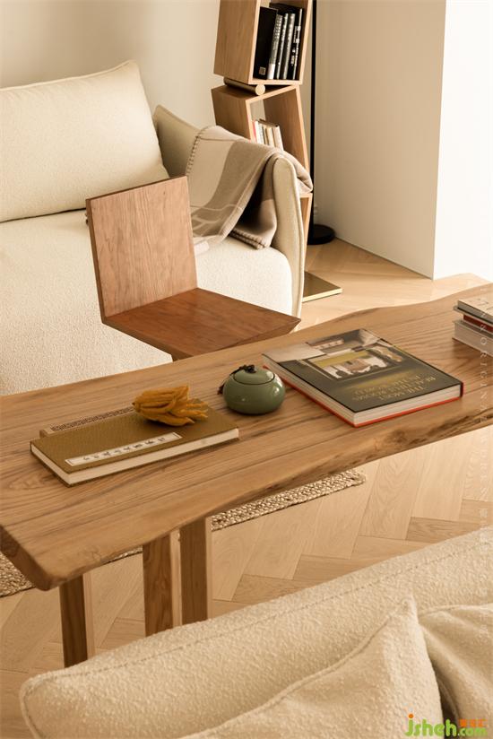 絨布沙發(fā)+實木桌椅,造型樸實大方、線條飽滿流暢,沒有經(jīng)過人工刻意地修剪,留存著自然的美感。