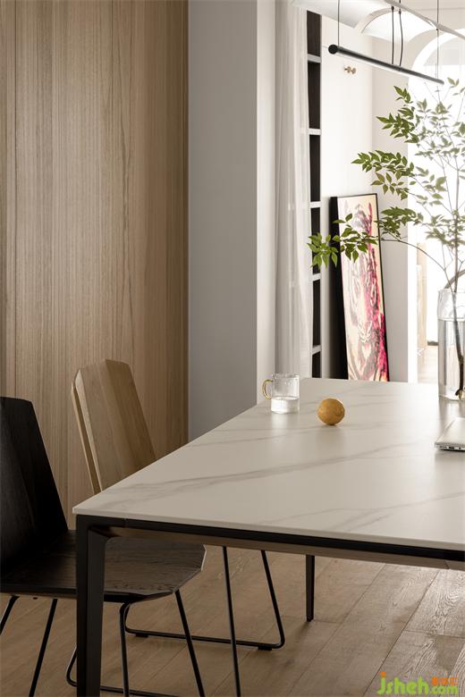 木質(zhì)地板,整體有種在大自然中的感覺,再搭配綠植吊鐘,和簡約吊燈,自然的光線打在餐桌上,杭州世貿(mào)之西湖家裝設(shè)計(jì)整體環(huán)境顯得格外清爽與溫馨。