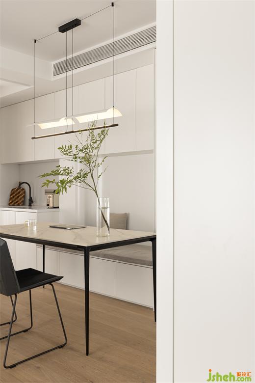餐廳的另外一邊設(shè)計(jì)的是一體柜式座椅,優(yōu)化了餐廳的空間,杭州世貿(mào)之西湖家裝設(shè)計(jì)整體設(shè)計(jì)空間更加融合。