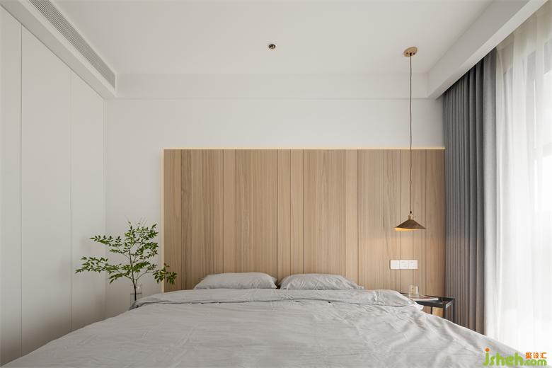 The bedside background wall echoes the color of the floor, with the light gray and gauze curtains of the curtains, flexible and vibrant, the log style design can always give people a soft and comfortable, elegant and warm feeling, which is also the yearning for home.