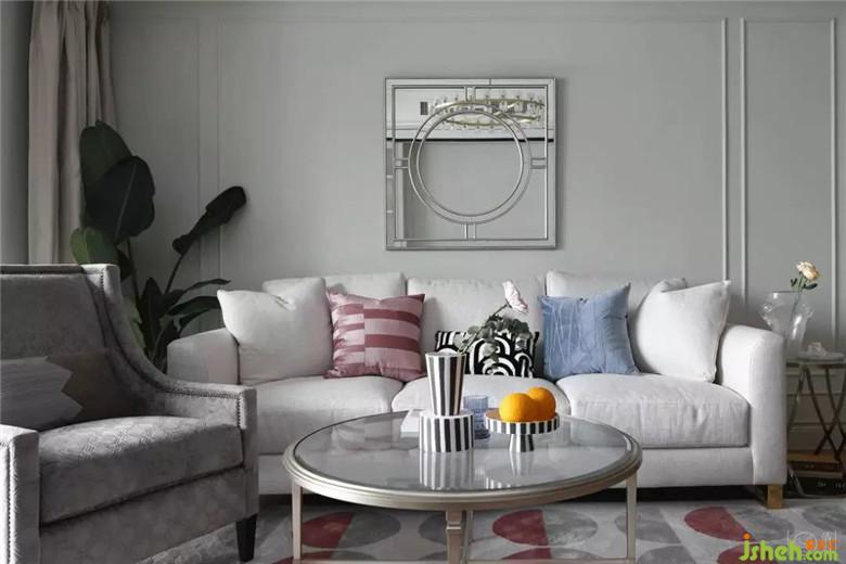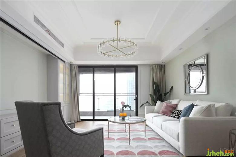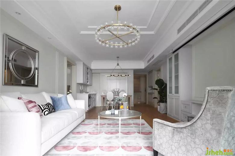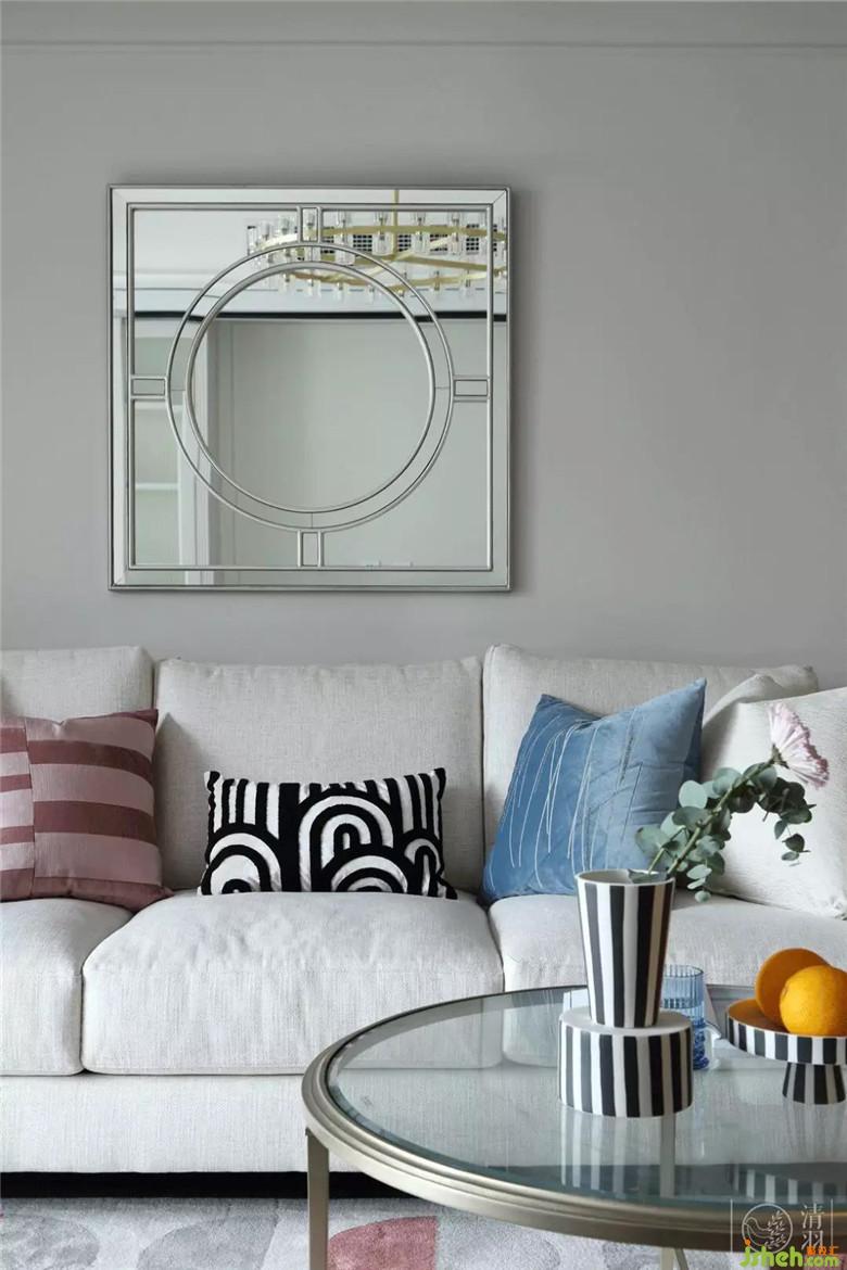 經(jīng)由我們軟裝改造后的客廳是一個(gè)充滿幾何美的小天地,優(yōu)雅素凈之中,又不失活潑生趣,壁上的圓形造型鏡與垂懸的吊燈、簡(jiǎn)約茶幾以及地毯相互呼應(yīng)著,墻面造型為空間增添了雅致感。