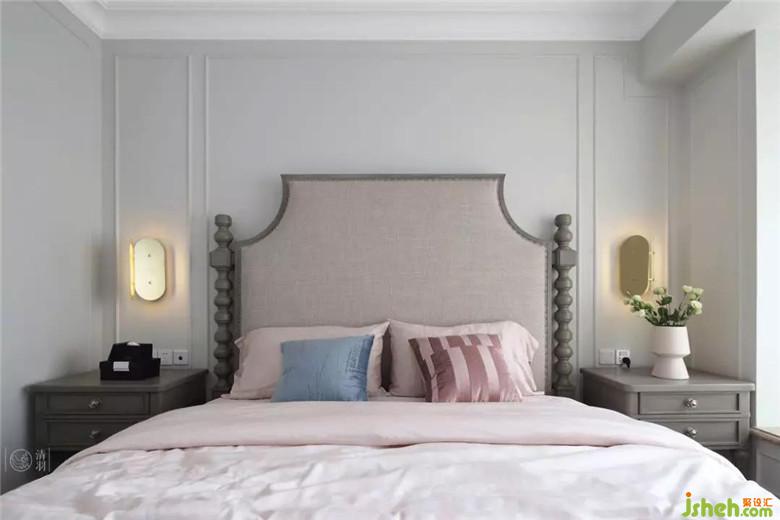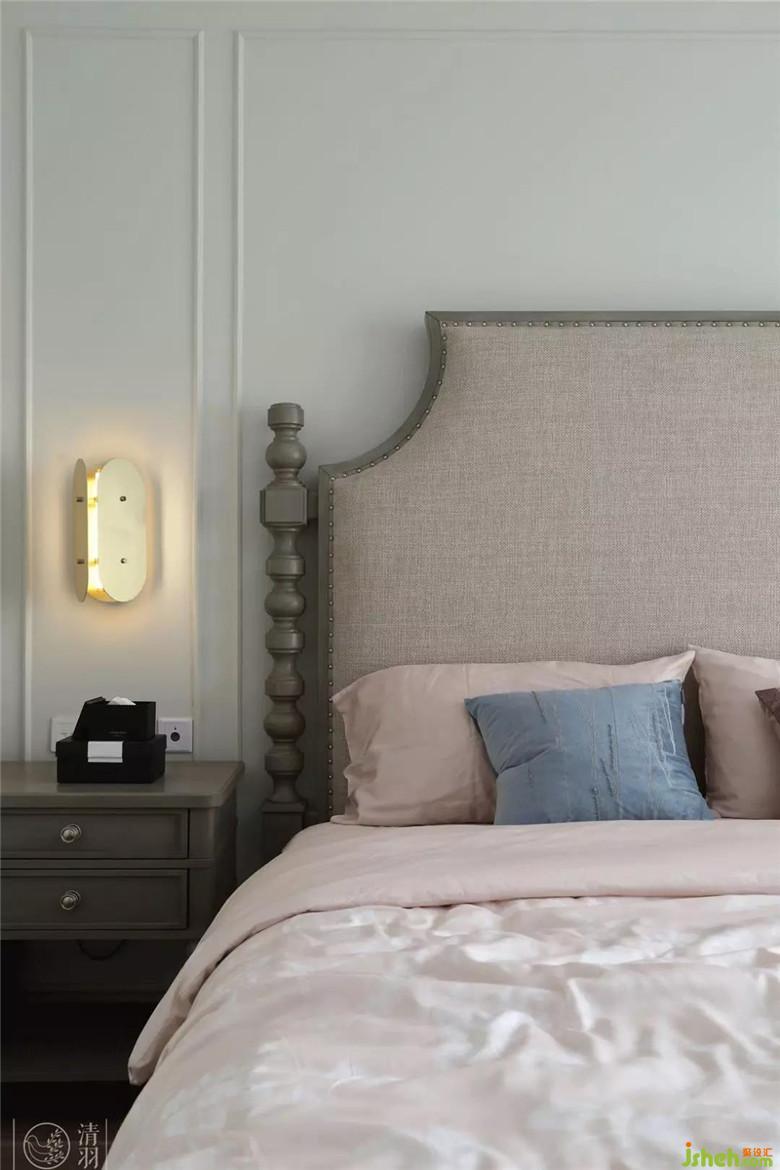 自古紅藍(lán)出cp,這里清爽的藍(lán)與粉嫩的紅呼應(yīng)了客廳的設(shè)計(jì),搭配上精美的吊燈和大氣的床頭營(yíng)造出了浪漫感和如玉一般溫和柔潤(rùn)的視覺(jué)觀感,妥妥地滿足女主人的少女心。