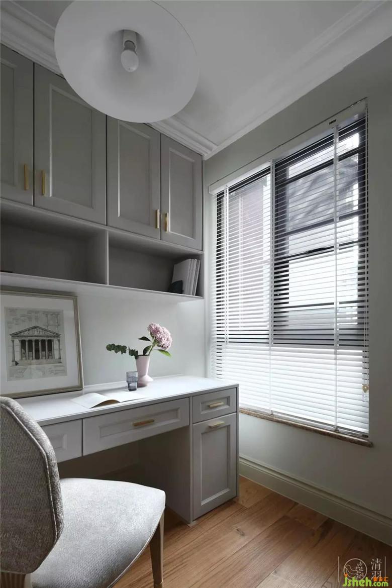 書(shū)房間采用無(wú)彩色和自然色,柔和溫暖的日光從一側(cè)的簾間傾灑下來(lái),頂燈就如一朵倒懸綻放的喇叭花??臻g之中流瀉著溫馨靜謐的氛圍。