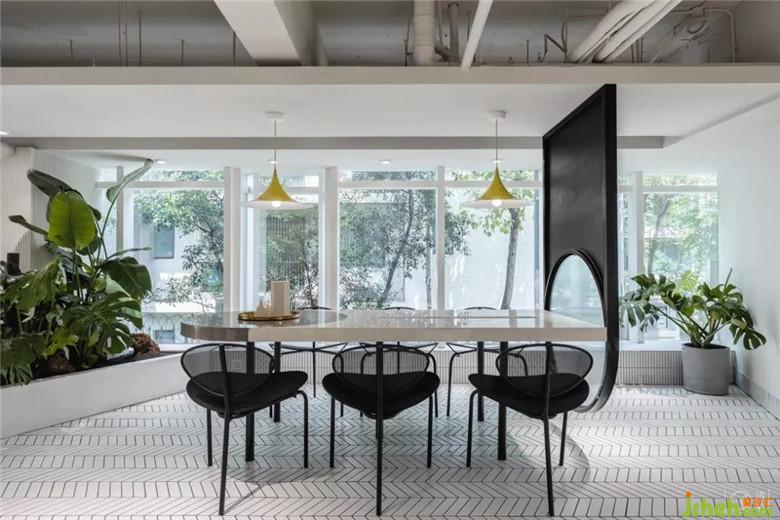 當(dāng)然,餐飲店不得不考慮的就是多人聚餐,因此一張與空間整體風(fēng)格相得益彰的大桌子是必備。稍大面積的灰白拼色石材桌面,不會顯得突兀,在某種角度也給人一種行星墜落既視感,不失趣味。