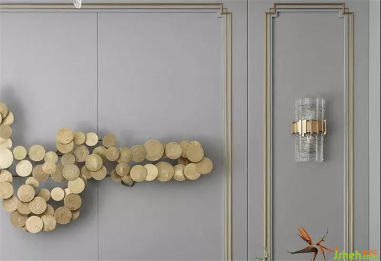 我們知道,金色與灰藍(lán)色的搭配、以及金色金屬的光澤很容易讓人與高級感劃等號,可如果大范圍的使用,只會給人“暴發(fā)戶、土豪”感。因此,在客廳的主體裝飾設(shè)計上,我們?yōu)闃I(yè)主定制了一組純手工打造的,錘目紋淡金色銅制藝術(shù)裝置上墻點睛。墻面以純手工錘制的淡金色銅制線條呼應(yīng)。