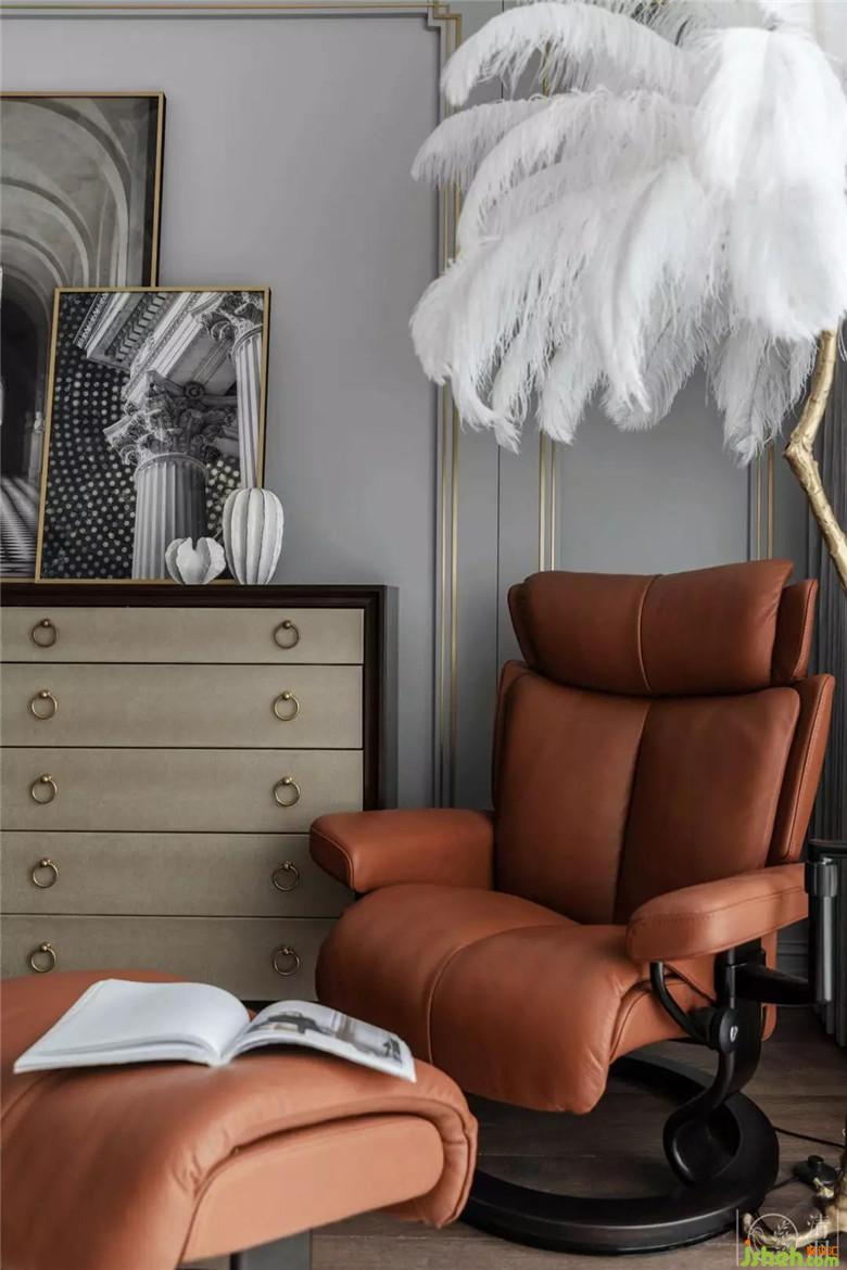 臥室,是相對(duì)容易打造出高級(jí)感的空間。它更私密,卻也更能體現(xiàn)屋主的品味。我們定制了灰杏色的鴕鳥皮搭配黑色木頭包邊的床頭板,干凈簡(jiǎn)單的豎線條呼應(yīng)背景墻的走線,就是安靜、克制的休息空間了。窗邊的羽毛燈和挪威進(jìn)口的斯特萊斯皮質(zhì)休閑椅,又剛剛好的溫柔了一室的理性。