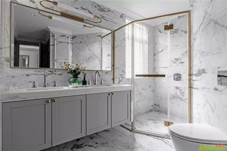 衛(wèi)生間,是必備空間,但它不用太奪目。它依然是淺色系大理石墻面、灰藍(lán)色的柜體加金色配件的整體搭配,你可以認(rèn)為它是在強(qiáng)化整體設(shè)計(jì)的高級(jí)感,也可以認(rèn)為,這個(gè)搭配本身就是這間屋子將要流傳的“經(jīng)典”。