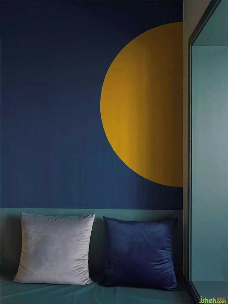 規(guī)劃好整個空間結構以后,我們對墻面進行了美化:在新建墻體時,盡量預留窗洞,然后用玻璃和幾何圖案組合為隔斷;用灰彩色乳膠漆分色出幾何圖案豐富視覺;在顏色的分配上,我們采取了局部重色局部留白的方式,留白部分的墻面會作為投影儀幕布功能使用。