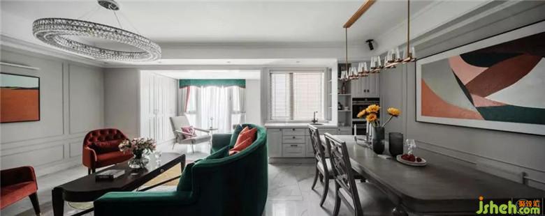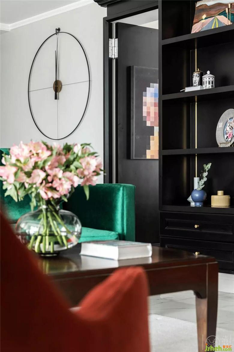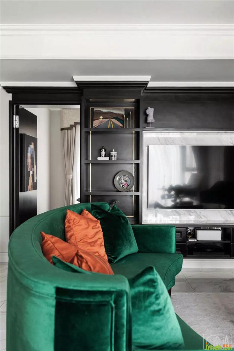 整個空間的配色都是經(jīng)過了精心的搭配:沙發(fā)、窗簾、抱枕、定制油畫,墨綠色、黑色和橘色貫穿在整個客廳餐廳區(qū)域。
