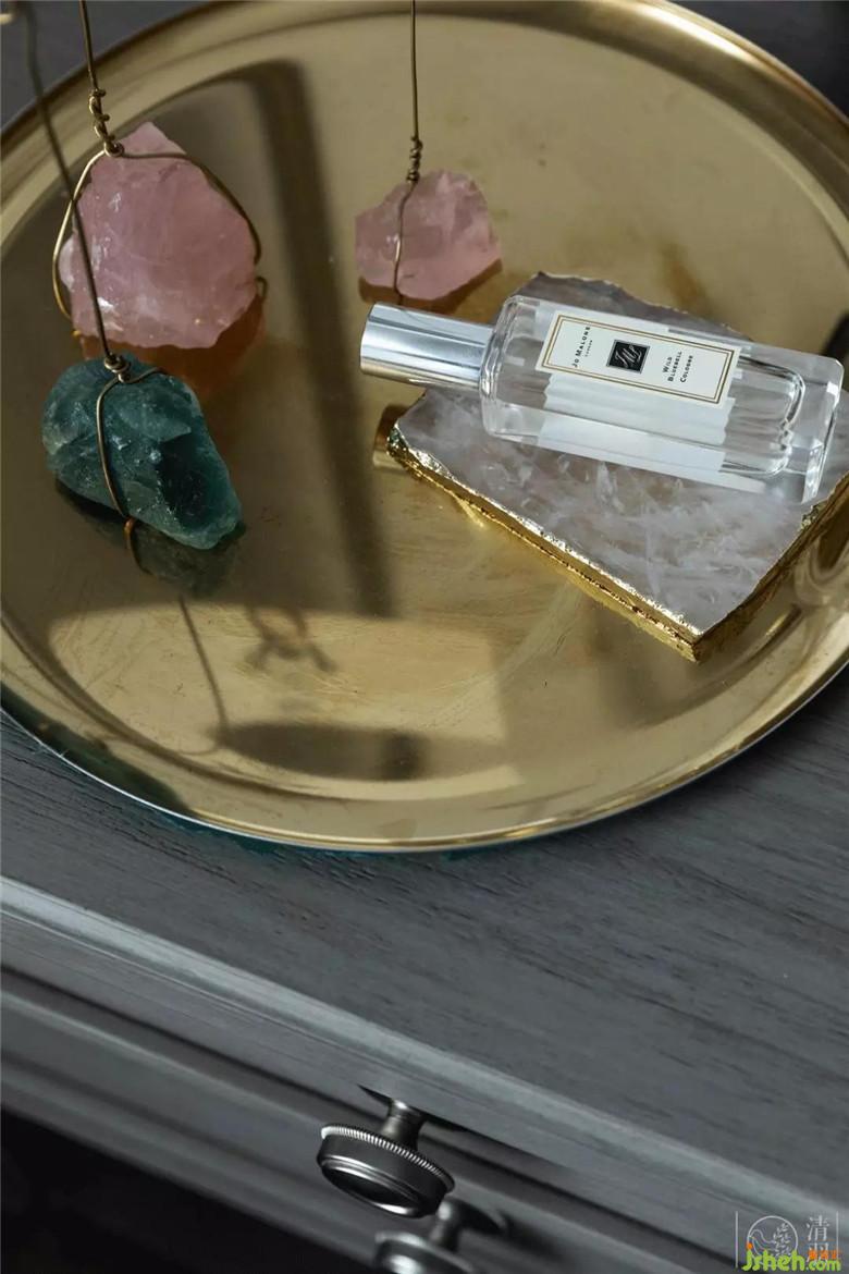 整個(gè)主臥室素雅安靜,局部使用了護(hù)墻板加金屬線條,增加空間的精致感。