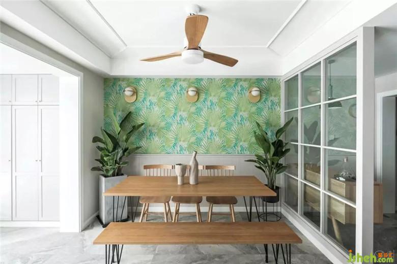 植物背景的墻紙和原木色的餐桌椅、風(fēng)扇燈讓餐廳的氛圍輕松愉悅。