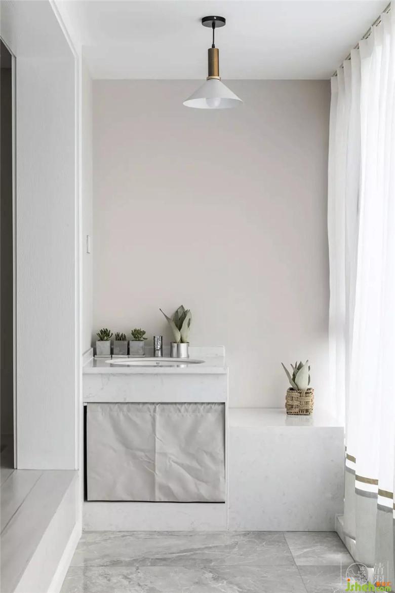 與客廳相連的休閑陽臺,我們?yōu)闃I(yè)主布置了洗手臺和花臺,方便業(yè)主打理植物和澆花。陽臺的另一頭,是為這個家容納雜物而設(shè)置的儲物柜。