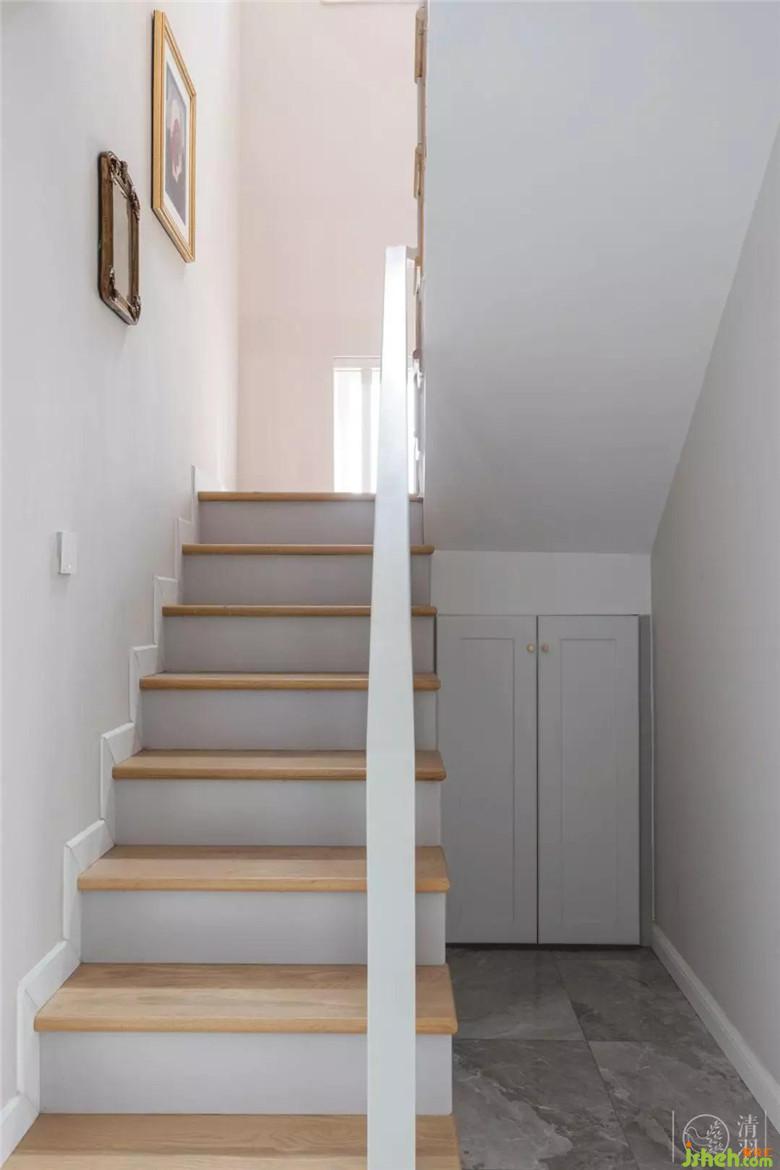 樓梯間的角落作為儲藏間使用。當(dāng)時,在我們的要求下,本是業(yè)主參加團(tuán)購的原木色單色樓梯在不增加造價的情況下改為了灰色+原木色的搭配,與室內(nèi)環(huán)境顯得融合又不單調(diào)。