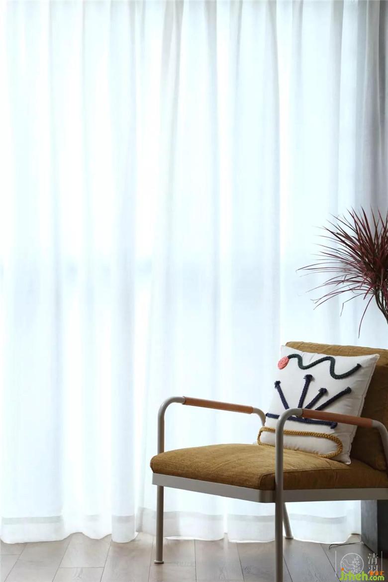 而顏色簡潔線條利落的床頭吊燈,金色的衣帽架,黃色與灰藍(lán)色撞色的窗簾又毫不突兀的讓整個(gè)空間時(shí)髦起來。