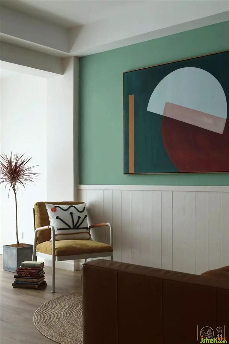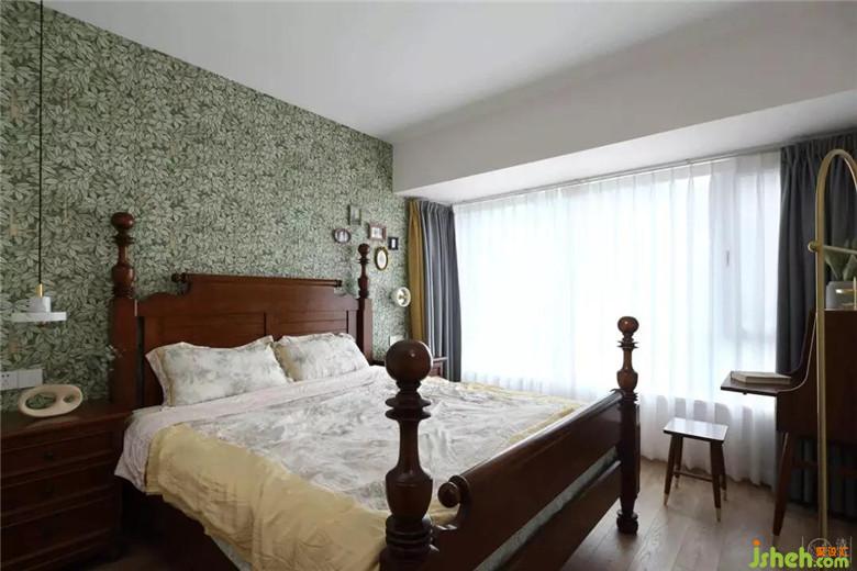 油畫質(zhì)感的植物系綠色墻紙,點(diǎn)綴上形狀各異的小相框,襯托著棕褐色的復(fù)古造型雙人床,讓臥室透出一股濃濃的美式復(fù)古感。