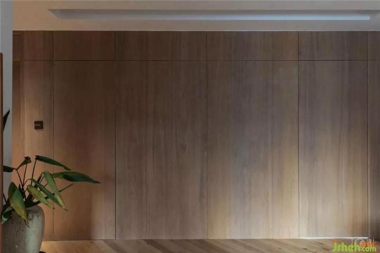 我們以到頂?shù)脑旧b飾面板上墻,巧妙地將次衛(wèi)與通向陽臺房間的墻面做成隱形墻,關(guān)上門即刻化身超大投影幕布背景墻。