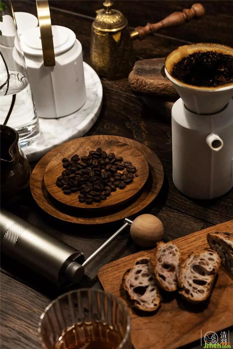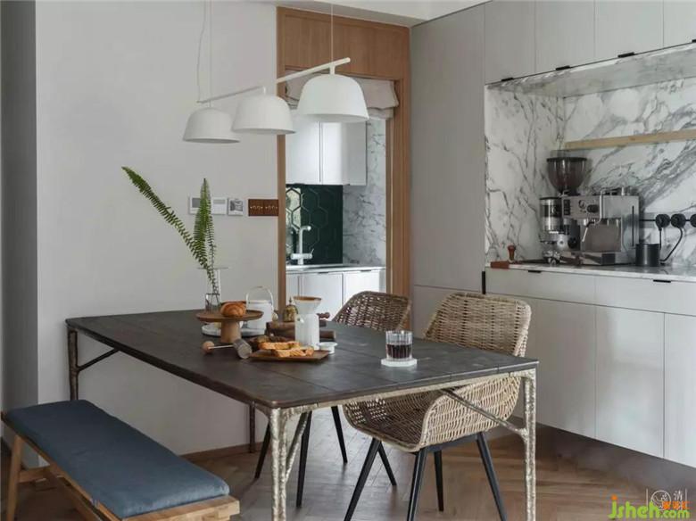 餐桌背后與廚房銜接的墻面,切割出一個嵌入式料理臺,前衛(wèi)而實用。放置上常用的咖啡機(jī)、手沖壺,方便日常使用的同時也再次強(qiáng)調(diào)了整個空間的“輕松休閑”感。
