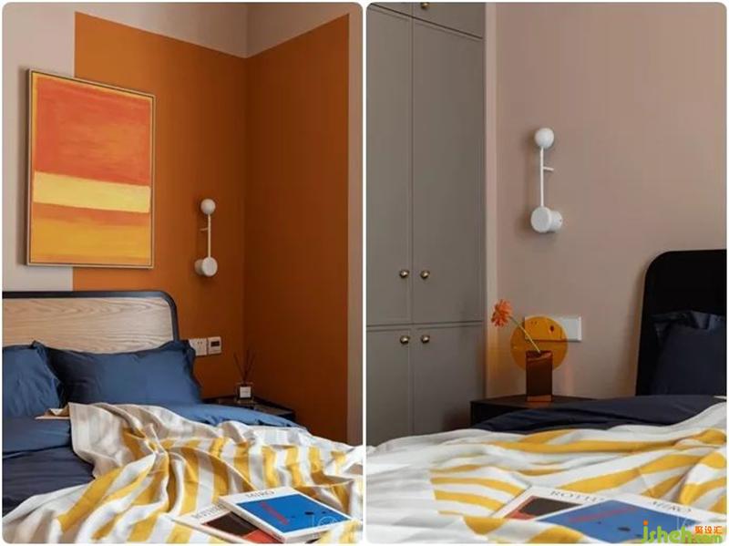 主臥依然多彩,但溫柔了許多,馬蒂斯的溫柔色塊在這里只做部分切割,柔和活力的橙只在轉(zhuǎn)角之間刷了一塊,留白更多,灰綠色的衣柜面板和極具包豪斯美感的黑邊木紋床頭呼應(yīng),營造出臥室舒適、放松的氛圍。