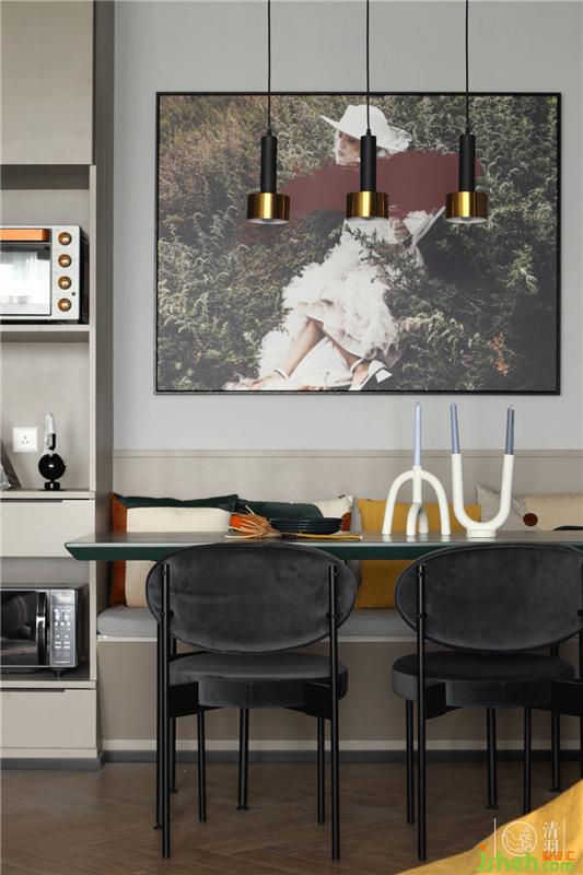 從客廳延伸到餐廳,整體布局呈現(xiàn)一字型,色調(diào)沿用客廳的淺灰色調(diào)為主,局部的暖色作點綴,增加空間層次感。同時考慮到座椅的舒適度,采用不規(guī)則方形的卡座設(shè)計節(jié)約了空間,在卡座下方放腳處增加一個斜度,提升用餐的體驗感。室內(nèi)設(shè)計師