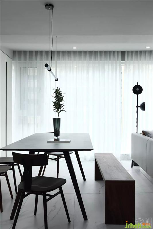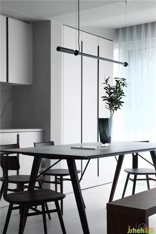 開放式的空間布局,使客廳和餐廳兩個(gè)空間之間相互貫通、相互融合。餐廳里我們用白色櫥柜將空間進(jìn)行延伸,用木質(zhì)的餐桌座椅以及家具拉手的黑色線條去緩解了空間里大面積白色帶來的清冷感,也將客廳與餐廳有效的進(jìn)行了融合。