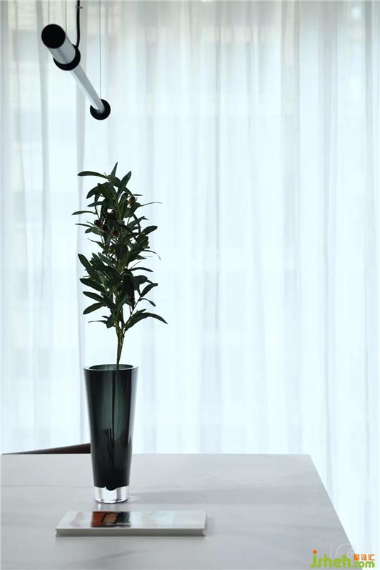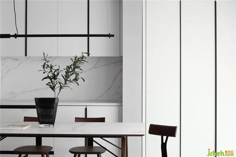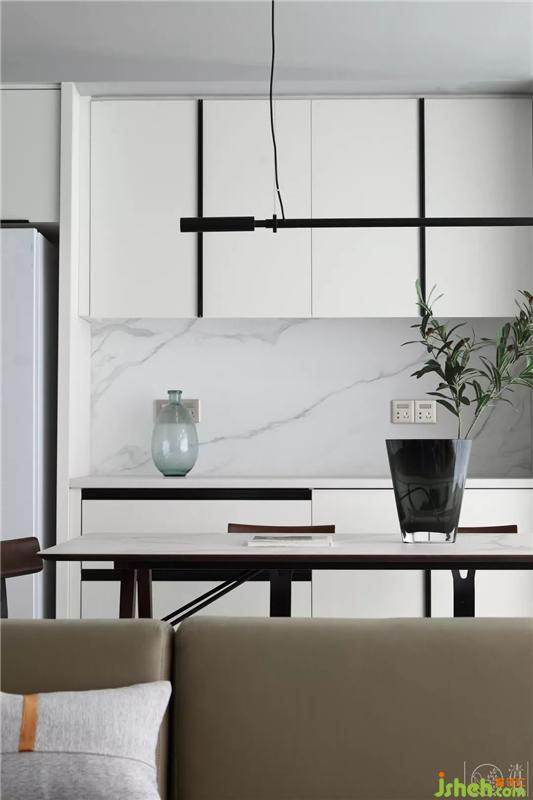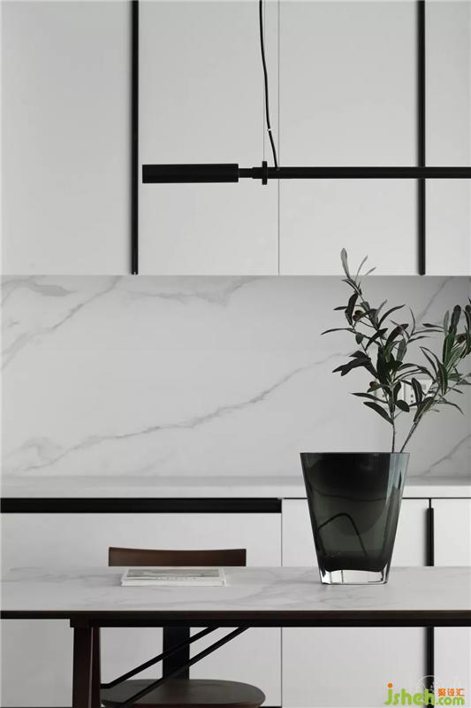 溝通過程中,我們了解到兔子平時(shí)有喜歡烘焙的習(xí)慣,在餐廳西廚區(qū)我們將冰箱嵌入到頂?shù)母吖?,增加了烘焙的操作區(qū),一字型的操作臺。通透開敞的空間里,造型干凈利落的頂面和墻面,搭配室內(nèi)純粹的現(xiàn)代氛圍,體現(xiàn)出兔子現(xiàn)代簡約的生活品質(zhì)感,也滿足了兔子閑暇之余想要制作西點(diǎn)、咖啡、果汁等興趣愛好。