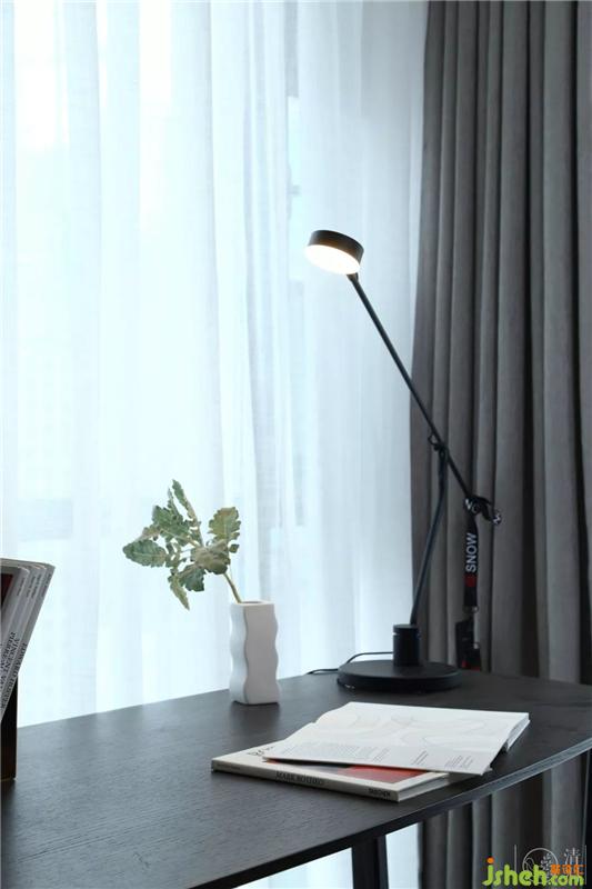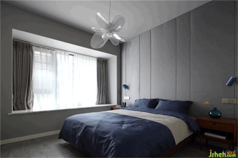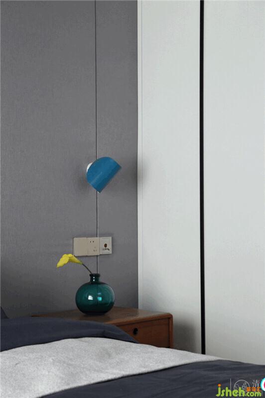 臥室,為了能更好的保證兔子的睡眠質量,我們舍棄了客廳的白色基調,運用了灰色調的墻面,再融合木質地板、灰色窗簾、藍灰色色調的家紡用品、深棕色色調的床頭柜作空間的配色,打破空間里的沉穩(wěn),豐富空間畫面,增加居住舒適度。