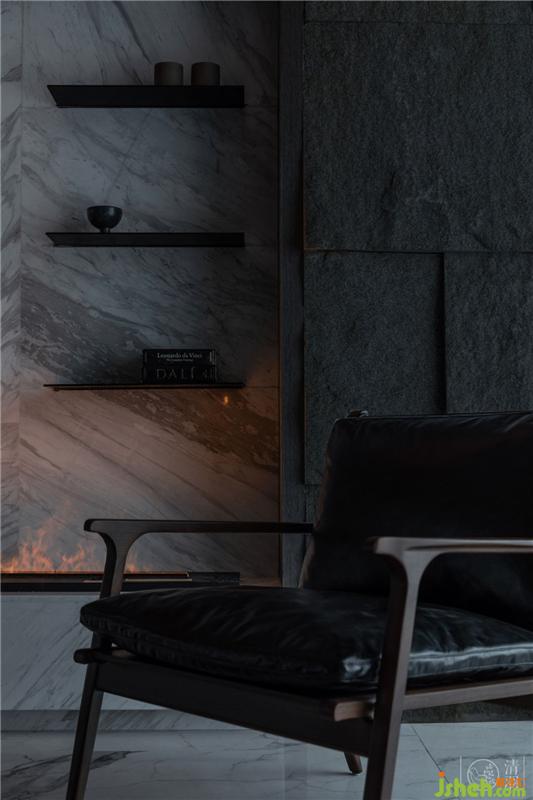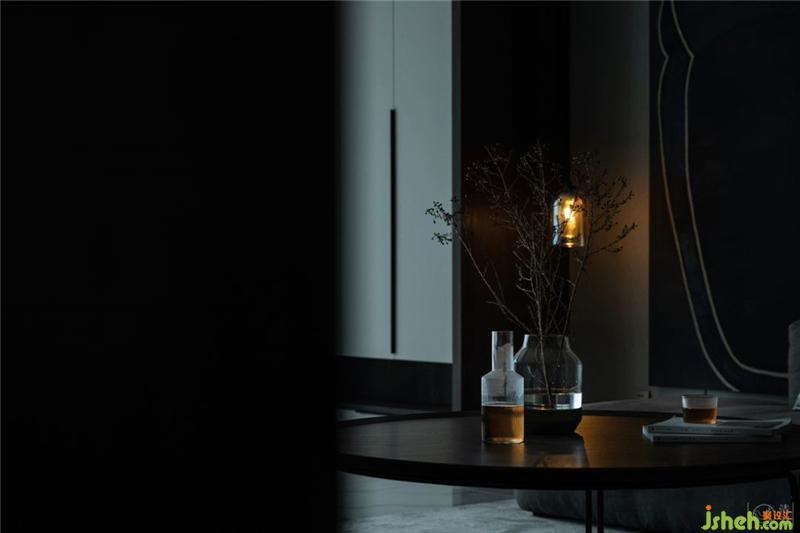 HAY的錫器灰色布藝沙發(fā),黑灰相間點綴的地毯,我們畫好圖然后特地找藝術(shù)家定制的油畫作品,Stellar works咖啡色茶幾和黑色邊幾以及造型沉穩(wěn)大氣的木質(zhì)軟包休閑椅、現(xiàn)代精致工業(yè)風(fēng)的磁吸燈,極簡的壁爐裝飾,幾塊預(yù)先裝入電視背景墻的黑色鋼板……幾乎十指可以數(shù)完的裝飾,恰到好處地豐富了空間的層次感。