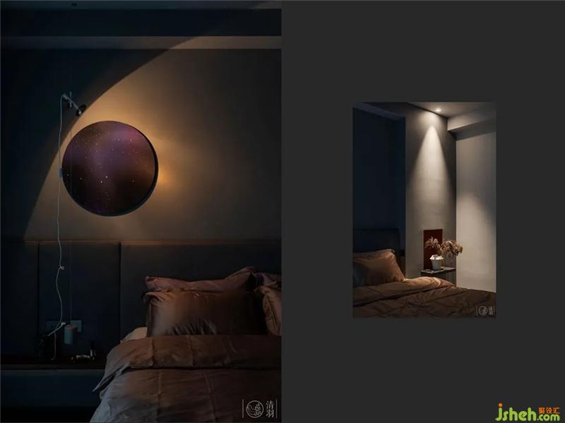 整體定制的床頭與床箱配上德國原裝的WULFF沃福床墊,預(yù)先嵌入墻體的置物板,可以裝飾也可以置物的壁龕,能上下滑動(dòng)、滿足不同生活需求的瑞典Pholc Blend混凝土Led吊燈,以及一塊星空藝術(shù)裝置,一張柔軟的白色地毯,就是為數(shù)不多的裝飾了。