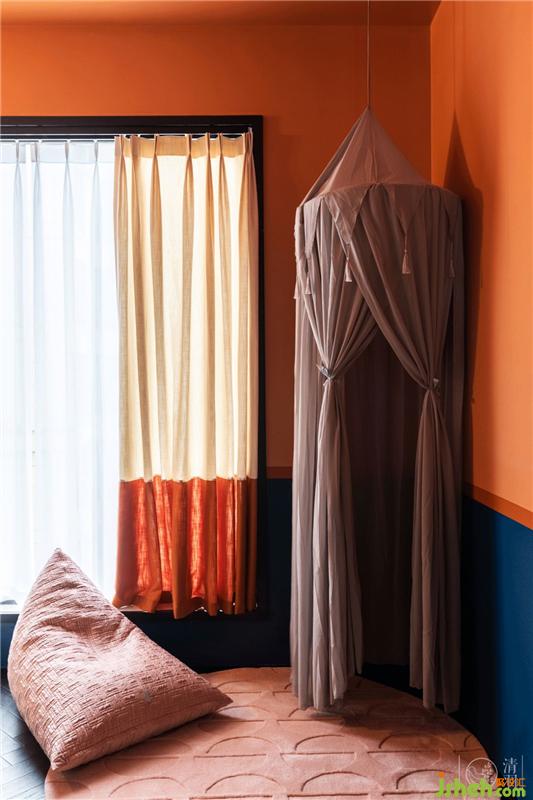 女兒房以橙藍(lán)對(duì)比色營造出空間輕松明快的氛圍,迷你的拱門圍繞成床的圍欄,又帶出一點(diǎn)騎士堡既視感,希望小姐姐能在這里成長成一位勇敢的“公主”。