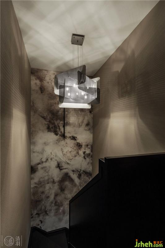 由于是復(fù)式結(jié)構(gòu),連接兩層樓的樓梯相對(duì)不會(huì)太寬太長(zhǎng)。我們結(jié)合TBS木質(zhì)樓梯簡(jiǎn)單利落的線條,用燈與藝術(shù)裝置產(chǎn)生的光影效果制造出空間交錯(cuò)感,來(lái)弱化較狹窄空間可能會(huì)產(chǎn)生的壓迫感。而在這樣的光影下,Nebulae的Italy Wall & Deco 墻紙讓樓梯間的墻面好似時(shí)空隧道的入口……