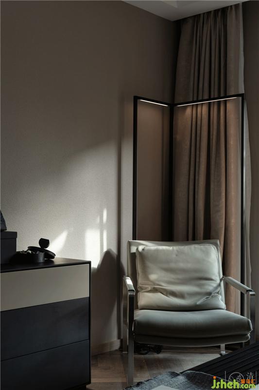 休閑區(qū)借Nemo Spigolo的直角線條落地?zé)簟肮串嫛绷艘粋€理性的閱讀角落。室內(nèi)設(shè)計師