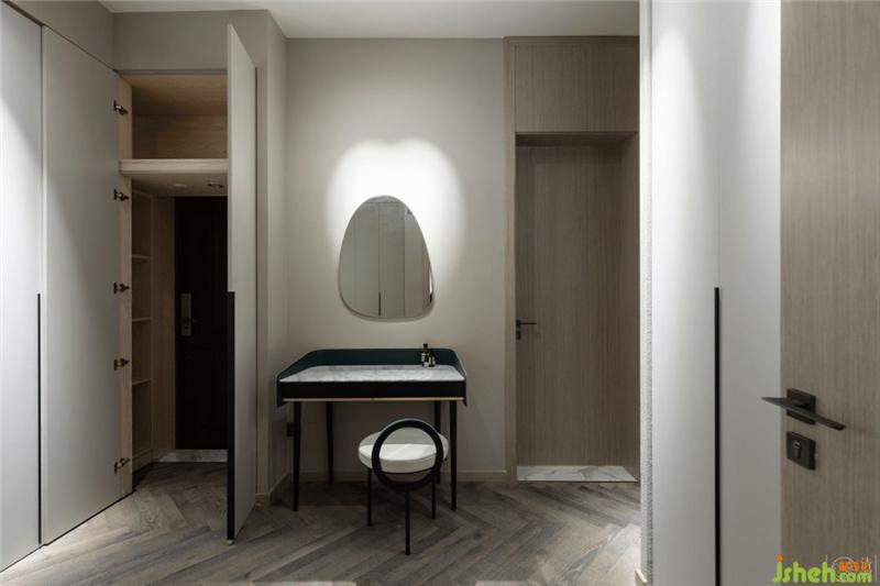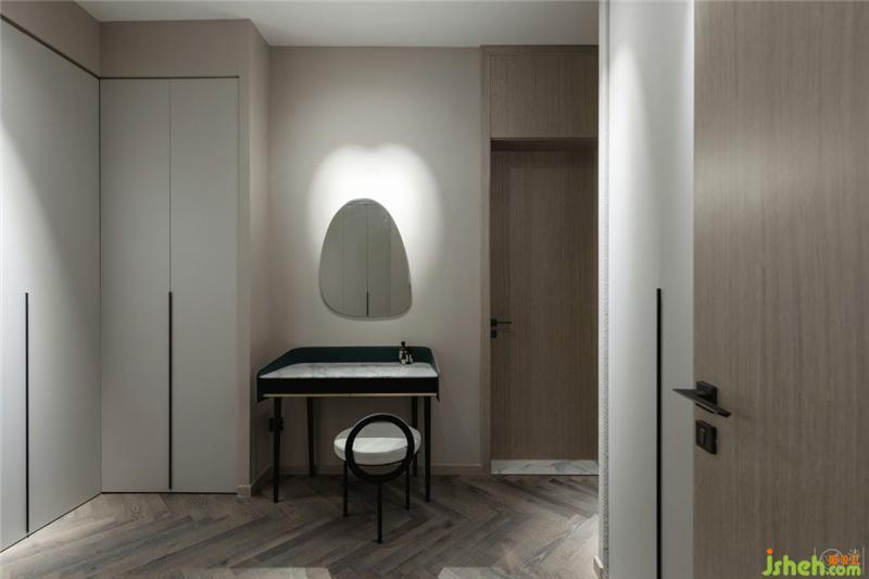 衣帽間安排了幾組射燈作為重點(diǎn)照明,梳妝臺(tái)的鏡子后面用光影做了個(gè)心形投射的小心思。室內(nèi)設(shè)計(jì)師