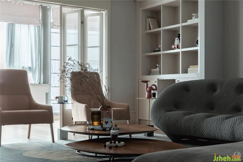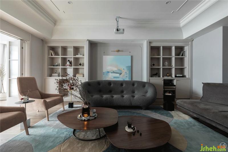 客廳的全套家具都來(lái)自Ligne Roset寫意空間,灰色網(wǎng)面布沙發(fā)是Ploum系列,極具曲線感,就像海浪,為平靜的海洋增添一絲韻律十足的趣味感。