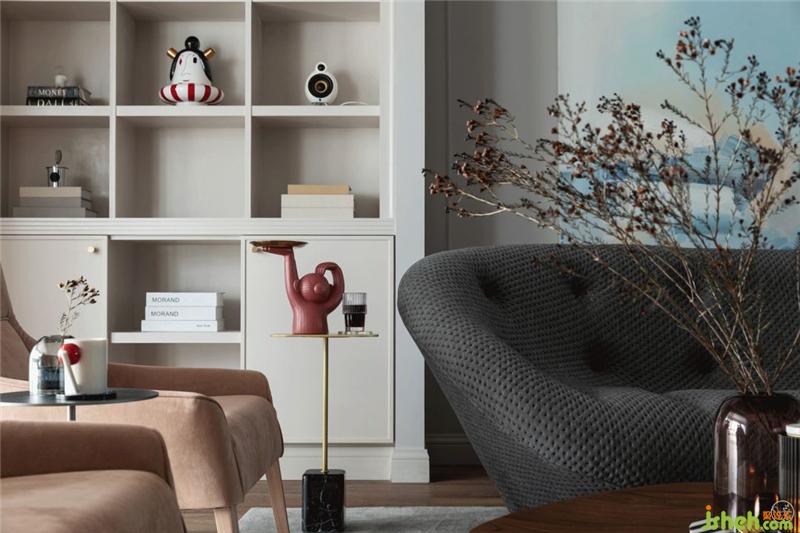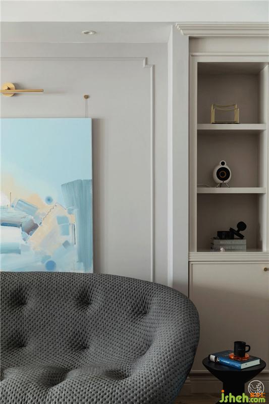 沙發(fā)背景墻的奶油白收納展示柜是現(xiàn)場(chǎng)制作的,大氣簡(jiǎn)潔。青年藝術(shù)家楊家勇的原創(chuàng)油畫,色彩淡雅,線條柔和而抽象,更添一絲寧?kù)o雅致。室內(nèi)設(shè)計(jì)師
