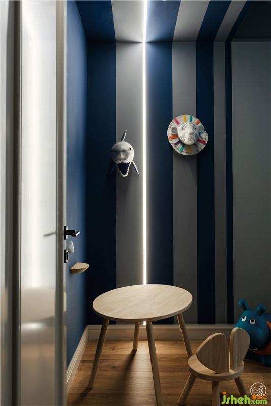 門后區(qū)域的設計也非常有意思,頂面到墻面做了像太空艙甬道的設計,深淺兩種藍色的線條勾勒出縱深感,白天就像在天空飛行,到了晚上,光帶燈一開,仿佛又一下子進入太空艙,讓孩子在這里盡情放飛想象。
