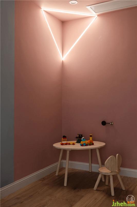 同樣呼應男孩房間,門后做了頂面墻面全粉色的設計,墻角的三角形線條光帶就像愛麗絲的兔子洞,望進去就是一個甜美的異想世界。室內設計師