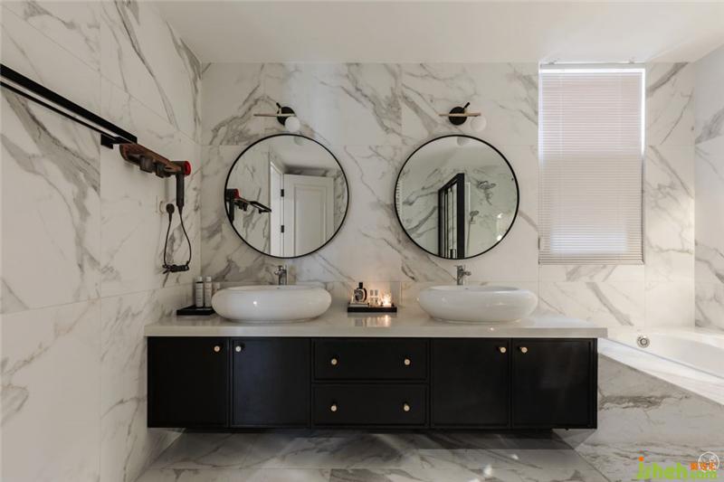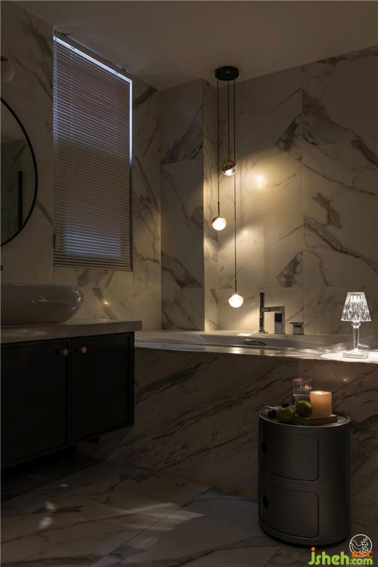 主衛(wèi)是潔凈夢幻的卷云,墻面地面都是水墨般流動的大理石紋,極具輕柔的整體感。浴缸墻角的圓形吊燈就像流星劃落,小巧復古的全水晶臺燈,點上香薰燭,陷入水的柔情和溫暖中,迎來一天最放松的時刻。室內(nèi)設(shè)計師