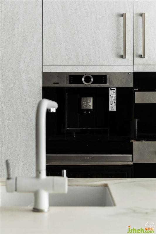 餐廳、廚房在負(fù)一層,因此我們有充足的空間去打造一個(gè)品質(zhì)感極佳,且能滿足二孩家庭多人、多功能操作需求的餐廚空間。