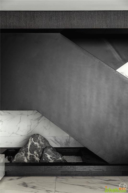 黑色全鋼板扶手,搭配擁有天然紋理的石材梯步,至下是人間煙火,至上則好似能夠通往無(wú)限的宇宙。