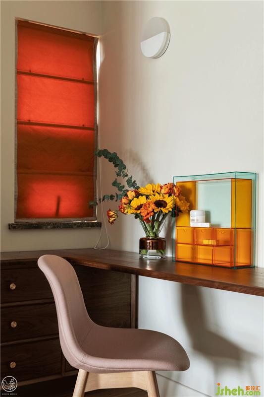 床頭的一側(cè),為Megan打造了一方法式風(fēng)情的梳妝區(qū),當(dāng)然也可以滿足閱讀、書寫的需求。