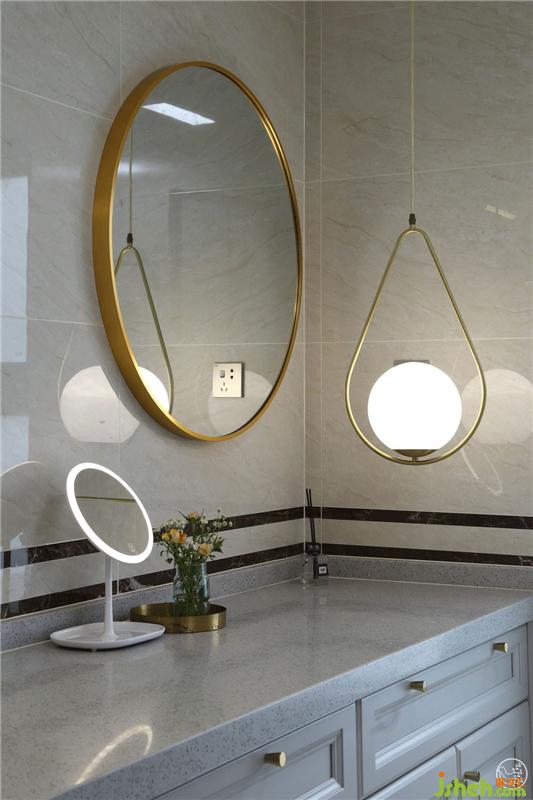主衛(wèi)與次衛(wèi)色調相近,但是風格卻大相徑庭,主衛(wèi)用白色紋路大理石搭配上黃銅的幾何燈與圓形鏡面,描繪出雅致的家庭生活情景。