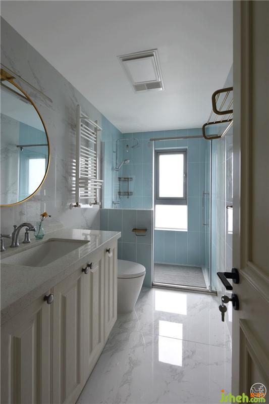 次衛(wèi)則不同,在大面積的白色大理石紋瓷磚中插入淺藍色瓷磚,清新典雅,又略顯俏皮。室內設計師