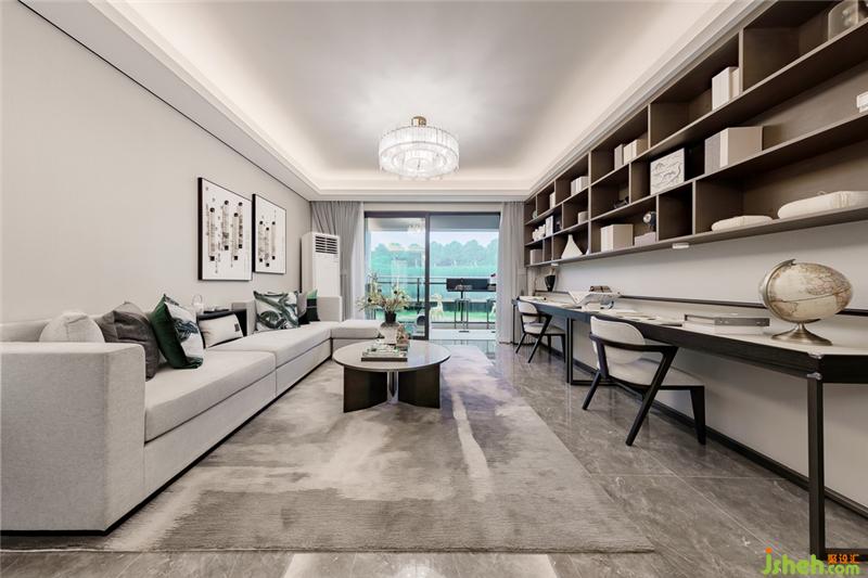 客廳開闊的視角將自然光引入,設(shè)計(jì)師以素雅色調(diào)打底,靜而不爭。區(qū)別于常規(guī)電視背景墻的處理,為了營造一個(gè)舒適且具備精神文化土壤的家,設(shè)計(jì)師另辟蹊徑,將日常徜徉書海揮毫潑墨的書房功能與客廳結(jié)合,同時(shí)顯示出精神和物質(zhì)的同等富足。