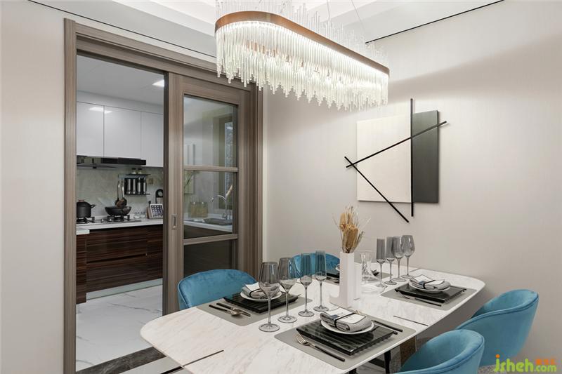 客餐廳并置的公共空間,7.6米進(jìn)深,具備大空間的舒適度和大氣感。藍(lán)色和古銅水晶燈在空間中映襯出生活的喜悅和溫馨,餐具杯盞散發(fā)出現(xiàn)代時(shí)尚的味道,幾何體塊和線條結(jié)合,構(gòu)成簡約卻耐人尋味的藝術(shù)品。
