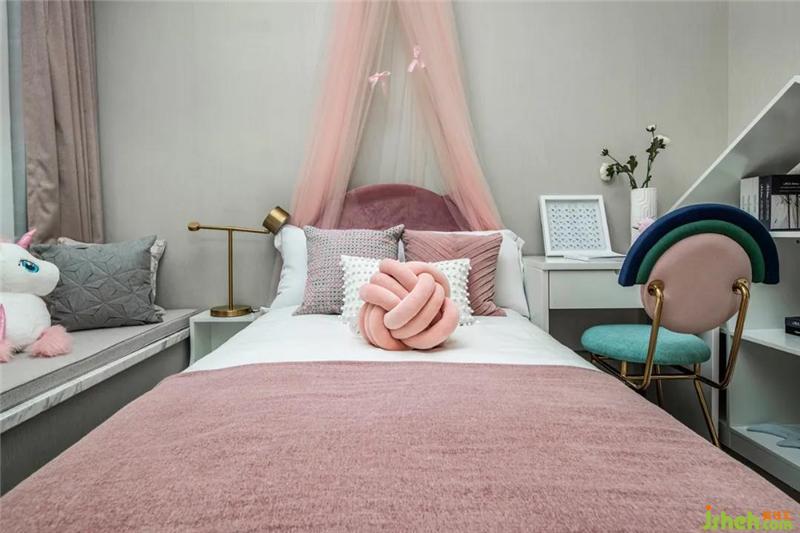 次臥借由甘石粉的優(yōu)雅浪漫表現(xiàn)新生代的生活訴求與價值態(tài)度,彰顯主人的個性。隨意的軟裝布置,增強空間品質(zhì)感與藝術(shù)氣息,藝術(shù)與幾何的碰撞,打造壹個充滿戲劇性的個性、溫暖空間。